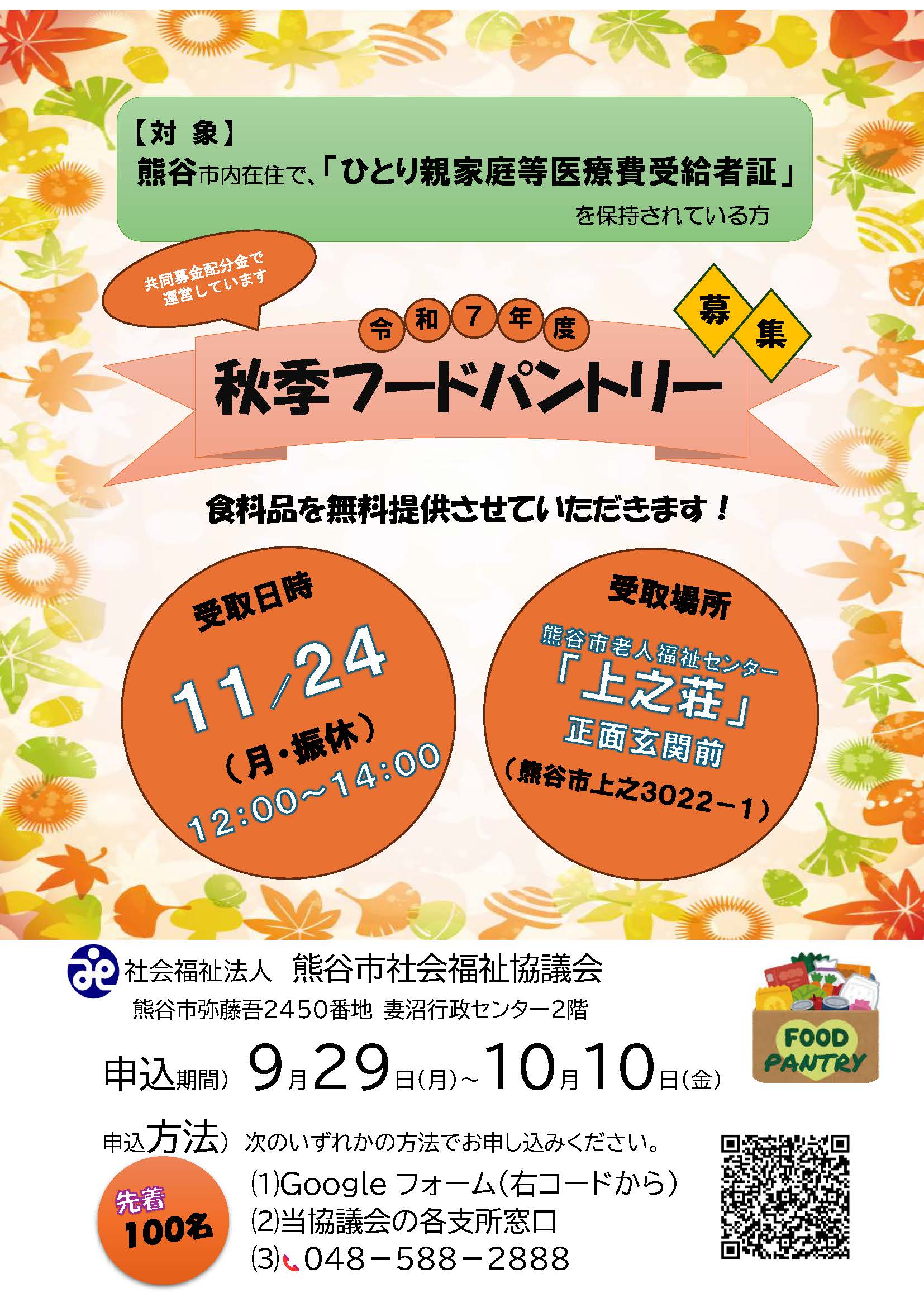 フードパントリー事業(食料品の無料提供)の申し込みが9月29日(月)から始まります。申込期間は10月10日(金)までとなります。 | ![]() |